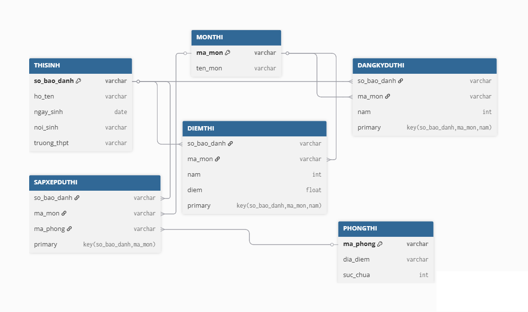- Diem (số thẻ học sinh, mã môn, năm, học kì, loại điểm, điểm), trong đó loại điểm chỉ các loại ĐĐG thường xuyên, ĐĐG giữa kì, ĐĐG cuối kì.